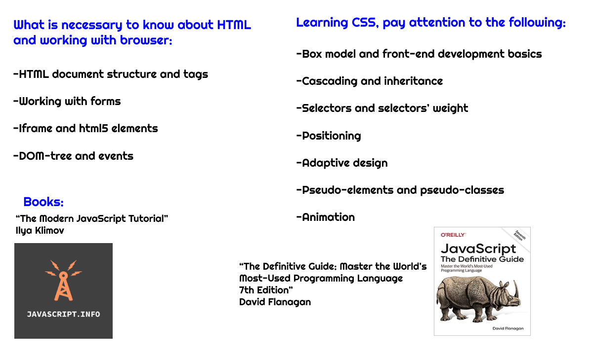 It’s also worthy to mention a popular book “The Modern JavaScript Tutorial” by Ilya Klimov because it covers the most important topics for learning the language. Another useful book is “The Definitive Guide: Master the World’s Most-Used Programming Language 7th Edition” by David Flanagan, which is a JavaScript Bible.